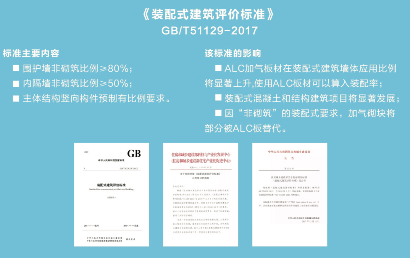 ■2017年12月 12日,中華人民共和國(guó)住房和城鄉(xiāng)建設(shè)部批準(zhǔn)發(fā)布《裝配式建筑評(píng)價(jià)標(biāo)準(zhǔn)》GBT51129.2017國(guó)家標(biāo)準(zhǔn),自2018年2月1日起實(shí)施。該標(biāo)準(zhǔn)極大的推動(dòng)了ALC板在裝配式建筑中的應(yīng)用,目前ALC板行業(yè)供不應(yīng)求。蒸壓加氣混凝上板(ALC板)是目前國(guó)家鼓勵(lì)和推廣裝配式建筑的主要裝配式部品部件墻體材料。